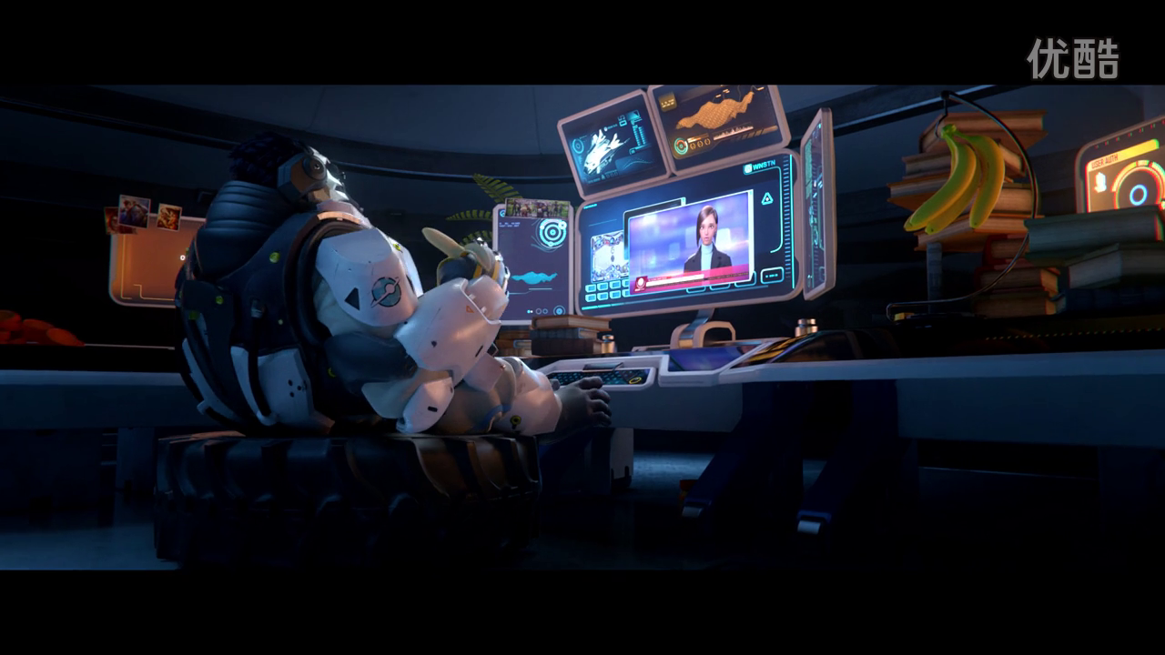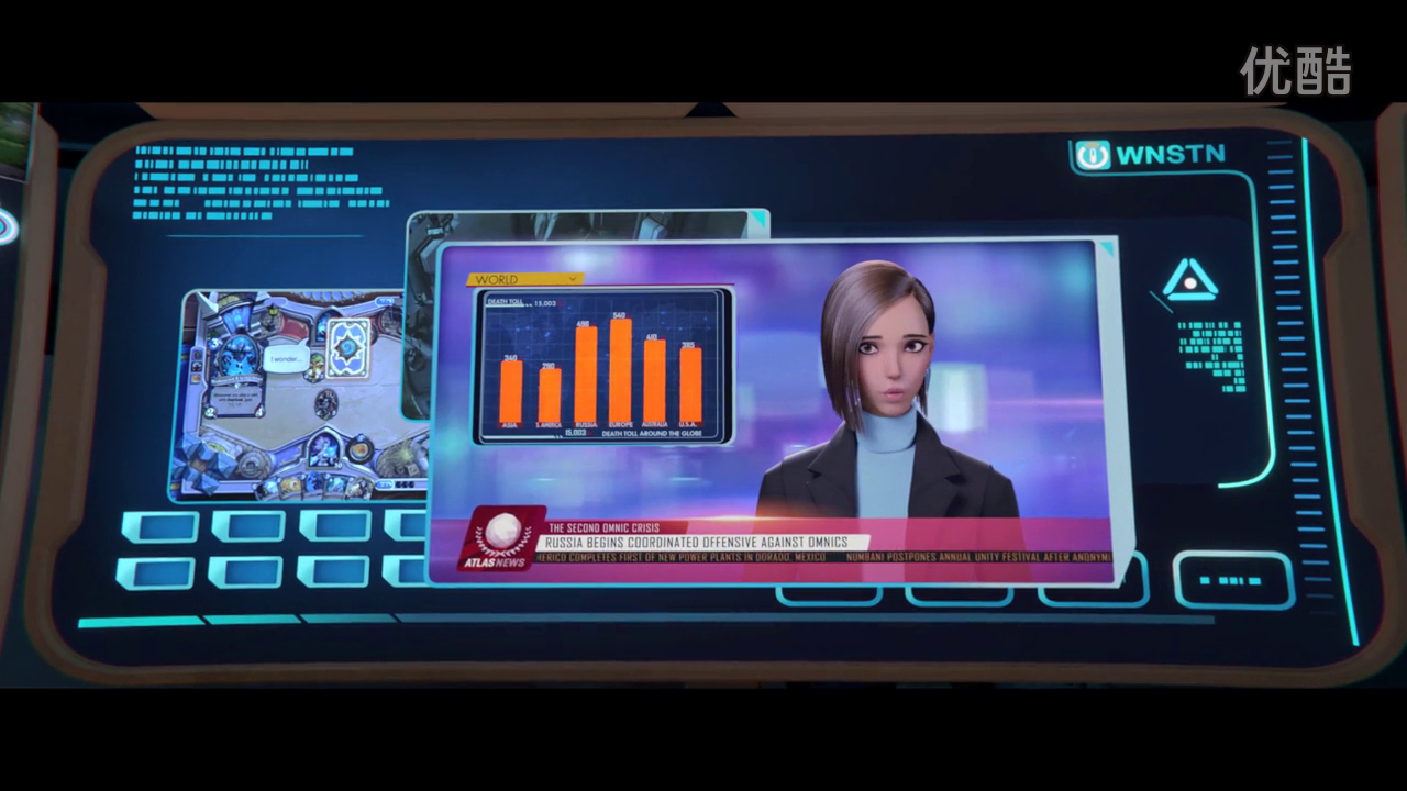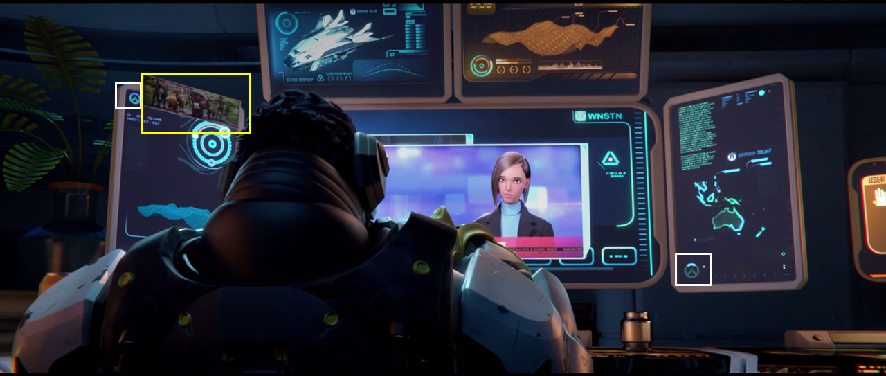 这个行路镜头提供了很多线索,构图也非常有深度,三个窗口,最下面那个是炉石彩蛋,彩的特别明显,向上一层是某个地方的监控画面或者静态图片,但是看不到主体,最上面一层是一个播送新闻的妹子。